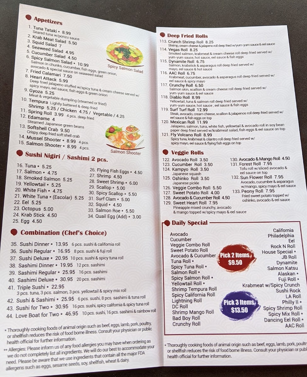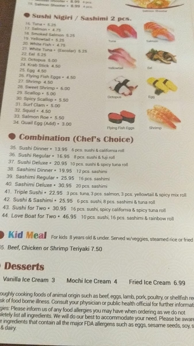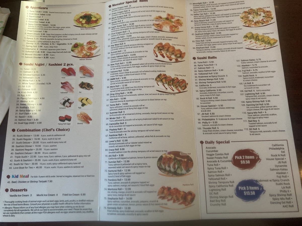 The menu showcases an impressive selection of Monster Special Rolls, such as the Green Dragon Roll and Playboy Roll, each expertly crafted with fresh ingredients and bold flavors, priced at just $9.00. For those seeking a more elaborate experience, the Chef's Choice Sashimi Dinner provides 12 pieces of premium sashimi for only $19.95.